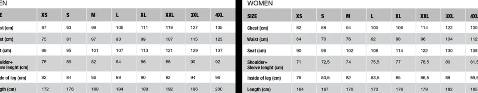 SizeChestWaistLow hipInside leg Sleeve length Height